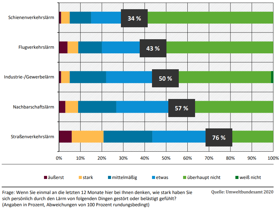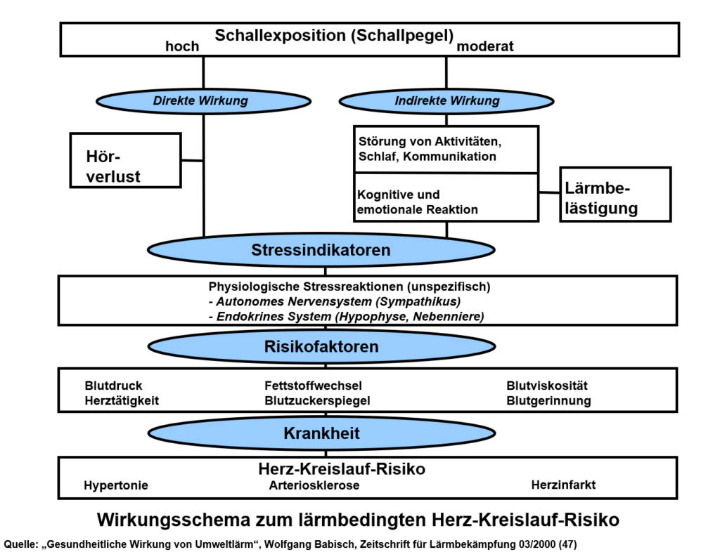 Die Auswirkungen von Lärm sind vielfältig: Veränderungen der Hörempfindlichkeit (Hörverlust, Berufskrankheit Nr.1), Ohrenklingen (Tinnitus), Änderungen des Kreislaufsystems (vegetative Funktionsstörungen, Bluthochdruck, Herzrhythmusstörungen, Auslösen von defensiven Reaktionen, Kardiovaskuläre und psychosomatische Störungen, Änderungen des Schlafes, psychiatrische Symptome (Nervosität, Kopfschmerzen, Gereiztheit, Niedergeschlagenheit). Die sozialen und psychologischen Lärmwirkungen sind: Kommunikationsstörungen, Kommunikationserschwerung, soziale Isolation und Entmischung, Nachlassen des Hilfeverhaltens, Belästigung, Bildungsnachteile, Psychosomatische Symptome, Niedergeschlagenheit, Verärgerung, Leistungsbeeinträchtigung, Stress, Nervosität, Aggressionen. Die ökonomischen Lärmwirkungen bedeuten Produktionsausfälle, Raumplanerische Kosten, Gesundheitskosten, Lärmschutzkosten, Miet- und Immobilienpreise.